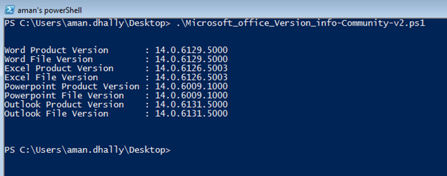To achieve it, i have written a tiny “Powershell” script. when you run the script, that will give you the file version and product version information of WORD, EXCEL, POWERPOINT and outlook.